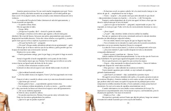 Cuando aterrizamos, mi cara estaba a unos centímetros de la suya. Su expresión era repentinamente seria. Se incorporó un poco, casi besándome, pero lo empujé para apartarlo. Sus cejas se enarcaron.— Déjalo ya, Trav— dije. Me mantuvo apretada contra él hasta que dejé de pelear y luego me arrancó el tirante del vestido haciendo que se me cayera del hombro.