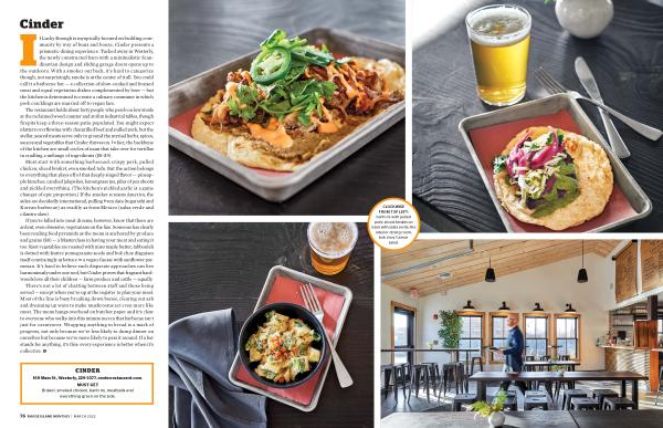 I f Lucky Enough is myopically focused on building community by way of buns and booze , Cinder presents a prismatic dining experience . Tucked away in Westerly , the newly constructed barn with a minimalistic Scandinavian design and sliding garage doors opens up to the outdoors . With a smoker out back , it ’ s hard to categorize though , not surprisingly , smoke is at the center of it all . You could call it a barbecue bar — a collection of slow-cooked and braised meat and equal vegetarian dishes complemented by beer — but the kitchen is determined to create a culinary commune in which pork cracklings are married off to vegan fare .