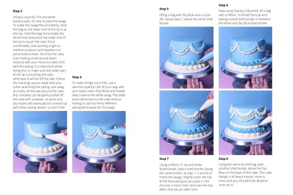 Using a Wilton 21 tip and white buttercream , pipe a shell border ( using the same motion as step 1 , 5 and 6 ) to frame the swags . Slightly cover the top of the blue piping as you pass it- this ensures a more clean and over-the-top effect that we are after here .