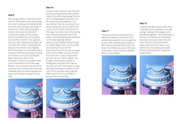 Next using a Wilton 16 ( Small Star ) tip with the Teal buttercream , start piping an S-Swirl in between the Sky Blue frills and white shell piping on the swag . To achieve an S-Swirl , start by piping a rosette clock-wise but instead of closing the rosette , pull the piping across in the direction you ’ re piping . Start another rosette in the opposite direction ( anti-clockwise ) and again , do not close the rosette , instead pull the piping in the direction you ’ re going across the swag . You will quickly notice that your hand and piping tip is making an ‘ S ’ motion , as if you ’ re writing the letter , hence the name of the technique . Continue this pattern until you ’ ve reached the end of the swag section . You can practice an S-Swirl on your work bench beforehand if you are unfamiliar with this style of piping until you ’ re comfortable to apply it to your cake .