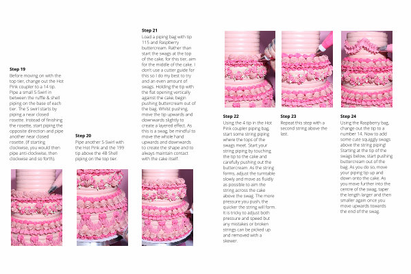 Step 22 Using the 4 tip in the Hot Pink coupler piping bag , start some string piping where the tops of the swags meet . Start your string piping by touching the tip to the cake and carefully pushing out the buttercream . As the string forms , adjust the turntable slowly and move as fluidly as possible to aim the string across the cake above the swag . The more pressure you push , the quicker the string will form . It is tricky to adjust both pressure and speed but any mistakes or broken strings can be picked up and removed with a skewer .