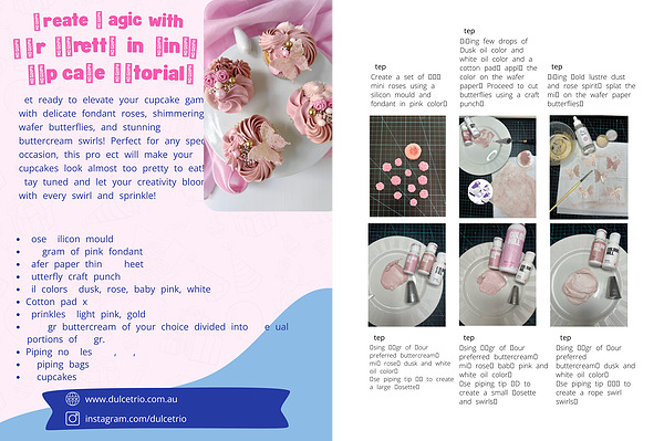 Rose Silicon mould 10 gram of pink fondant Wafer paper thin ½ Sheet Butterfly craft punch Oil colors : dusk , rose , baby pink , white Cotton pad x 1 Sprinkles : light pink , gold 120 gr buttercream of your choice divided into 3 equal portions of 60gr . Piping nozzles : 1E , 2D , 172 3 piping bags 10 ” 4 cupcakes www . dulcetrio . com . au instagram . com / dulcetrio3