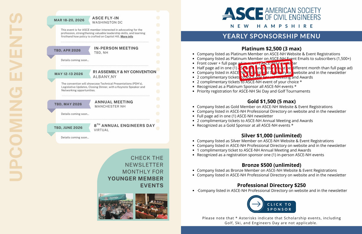 Company listed as Bronze Member on ASCE-NH Website & Event Registrations Company listed in ASCE-NH Professional Directory on website and in the newsletter