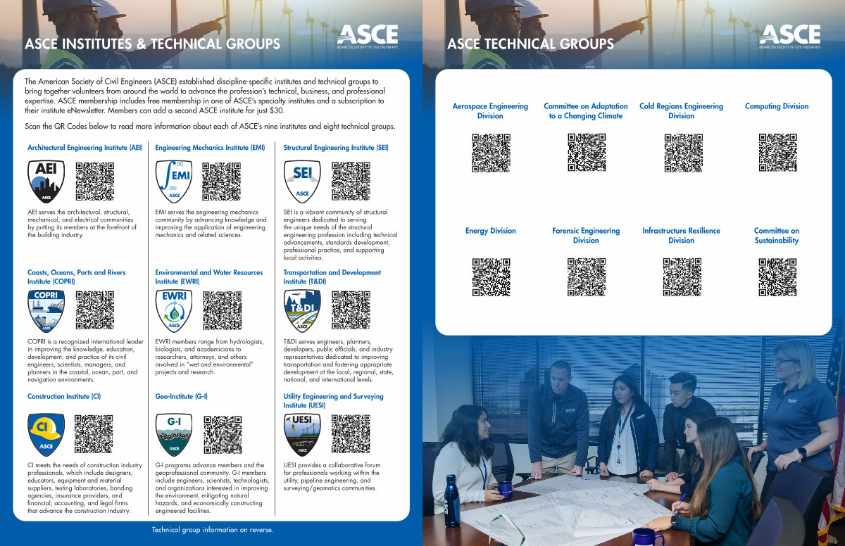 Scan the QR Codes below to read more information about each of ASCE’ s nine institutes and eight technical groups.
