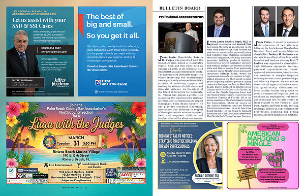 Jones Foster is proud to announce the elevation of two attorneys following the firm’ s Annual Shareholders Meeting. Trust and estate litigation shareholder Zachary M. Rothman was elevated to an officer of the firm, while litigation and land use attorney Brett T. Lashley was appointed a shareholder. Zack Rothman represents trustees, personal representatives, courtappointed administrators, beneficiaries, and creditors in complex litigation involving estates, trusts, guardianships, and fiduciary disputes. He also advises clients on all aspects of probate, trust, and guardianship administration. Brett Lashley focuses his practice on general commercial litigation, with an emphasis on employment, real estate, and municipal law. He also serves as legal counsel to the Towns of Lake Park, Jupiter, and Palm Beach, advising municipal clients on code enforcement proceedings, planning and zoning matters, and town commission meetings.