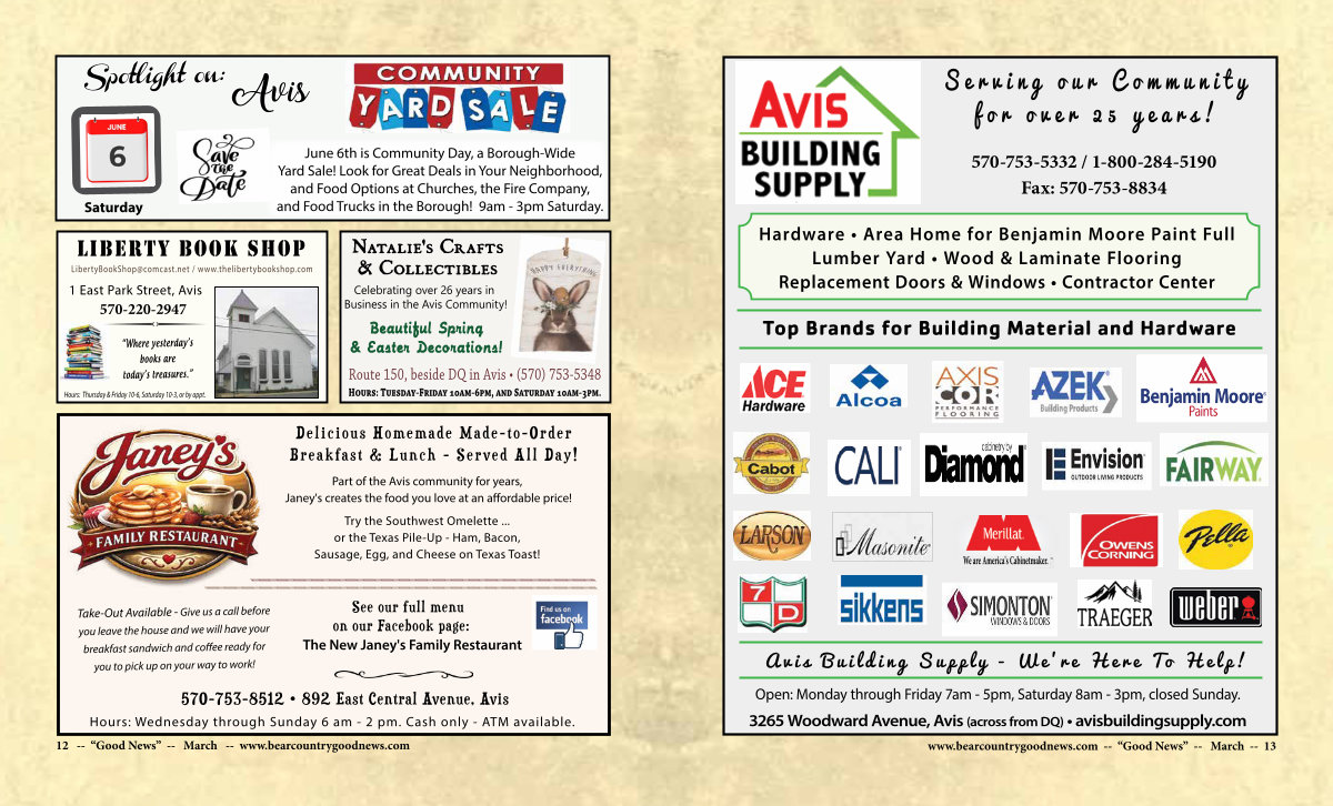 Open: Monday through Friday 7am- 5pm, Saturday 8am- 3pm, closed Sunday. 3265 Woodward Avenue, Avis( across from DQ) • avisbuildingsupply. com www. bearcountrygoodnews. com--“ Good News”-- March-- 13