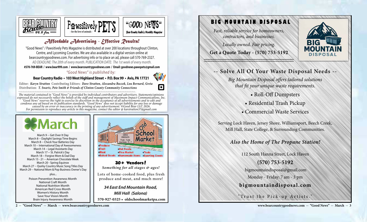 The material contained in " Good News " is provided by individual contributors and advertisers. Statements / opinions expressed do not necessarily reflect the beliefs of the staff and management of Maximum Impact Communications, Inc. " Good News " reserves the right to exercise its discretion in the acceptance of all advertisements and to edit and condense any ad based on its publication standards. " Good News " does not accept liability for any loss or damage caused by an error or inaccuracy in the printing of any advertisement. © Good Bear LLC 2026. For permission to reproduce any article in this magazine, contact the editor @ karstratton37 @ gmail. com