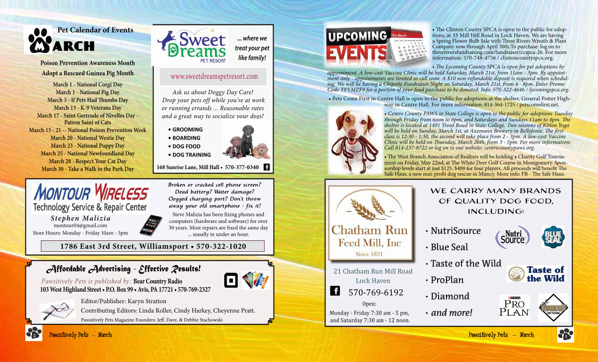 • Centre County PAWS in State College is open to the public for adoptions Tuesday through Friday from noon to 6pm, and Saturdays and Sundays 11am to 4pm. The shelter is located at 1401 Trout Road in State College. Two sessions of Kitten Yoga will be held on Sunday, March 1st, at Axemann Brewery in Bellefonte. The first class is 12:30- 1:30, the second will take place from 2- 3pm. A low-cost Vaccine Clinic will be held on Thursday, March 26th, from 3- 5pm. For more information: Call 814-237-8722 or log on to our website: centrecountypaws. org.