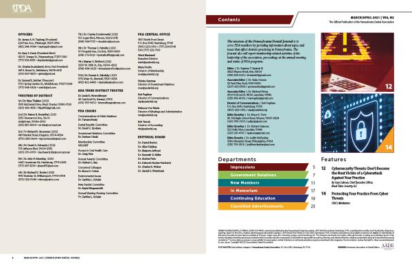 PENNSYLVANIA DENTAL JOURNAL ( ISSN 0031-4439 ), owned and published by the Pennsylvania Dental Association , 3501 North Front Street , Harrisburg , 17110 , is published bi-monthly : Jan / Feb , Mar / Apr , May / June , July / Aug , Sept / Oct , Nov / Dec . Address advertising and subscription queries to 3501 North Front Street , P . O . Box 3341 , Harrisburg , 17105 . Domestic subscriptions are available to persons not eligible for membership at $ 36 / year ; International subscriptions available at $ 75 / year . Single copies $ 10 . Periodical postage paid at Harrisburg , PA . “ The Pennsylvania Dental Association , although formally accepting and publishing reports of the various standing committees and essays read before the Association ( and its components ), holds itself not responsible for opinions , theories , and criticisms therein contained , except when adopted or sanctioned by special resolutions .” The Association assumes no responsibility for any program content of lectures in continuing education programs advertised in this magazine . The Association reserves the right to refuse any advertisement for any reason . Copyright © 2021 , Pennsylvania Dental Association .