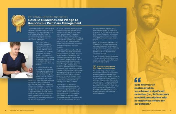 “ At Pitt Dental Medicine , we are committed to combatting the opioid crisis ,” said Bernard J . Costello , DMD , MD , dean of Pitt ’ s School of Dental Medicine and the author of the Costello Guidelines and the Costello Pledge . “ The Costello Pledge was developed to reinforce our own accountability in prescribing pain medications , and we invite all prescribers throughout the medical and dental community to demonstrate their devotion to these same principles in their own patients ’ care . We believe it ’ s simply a matter of holding ourselves to the highest ethical standards and staying true to our responsibilities as healthcare professionals in the spirit of ‘ first , do no harm .’”
