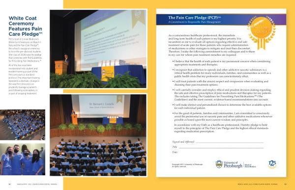 Pitt School of Dental Medicine ’ s White Coat Ceremony on March 5 featured the Pain Care Pledge™ , the school ’ s inaugural ceremony to have the pre-doctoral students ( the class of 2024 ) take the pledge that correlates with The Guidelines for Prescribing Pain Medications . ™