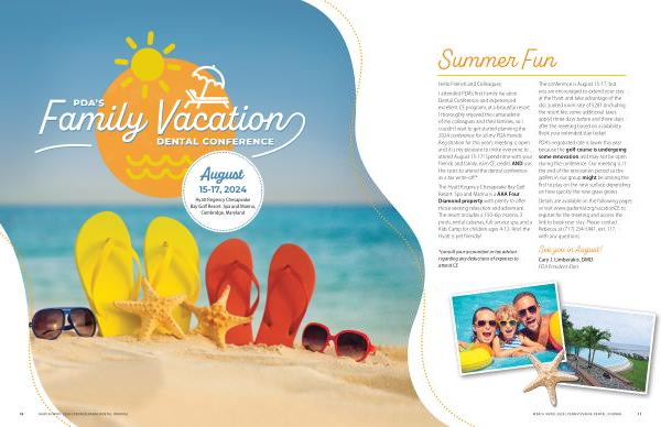 I attended PDA ’ s first Family Vacation Dental Conference and experienced excellent CE programs at a beautiful resort . I thoroughly enjoyed the camaraderie of my colleagues and their families , so I couldn ’ t wait to get started planning the 2024 conference for all my PDA friends . Registration for this year ’ s meeting is open and it is my pleasure to invite everyone to attend August 15-17 ! Spend time with your friends and family , earn CE credits AND use the costs to attend the dental conference as a tax write-off .*