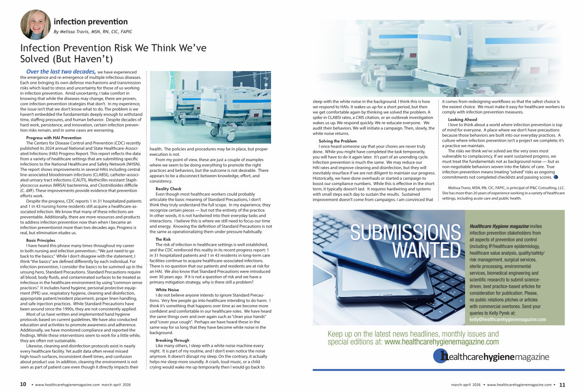 Healthcare Hygiene magazine invites infection prevention stakeholders from all aspects of prevention and control( including IP / healthcare epidemiology, healthcare value analysis, quality / safety / risk management, surgical services, sterile processing, environmental services, biomedical engineering and scientific research) to submit sciencedriven, best practice-based articles for consideration for publication. Please, no public relations pitches or articles with commercial overtones. Send your queries to Kelly Pyrek at: kelly @ healthcarehygienemagazine. com