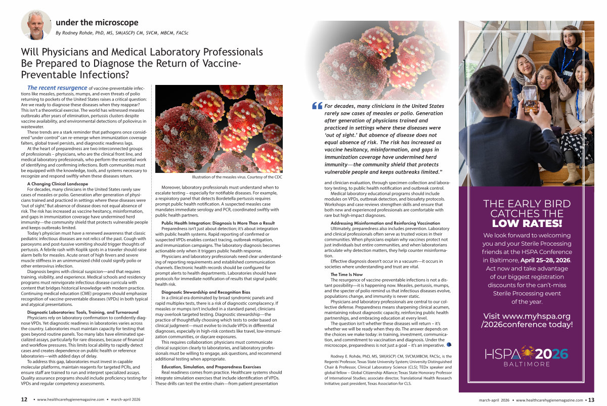 Rodney E. Rohde, PhD, MS, SM( ASCP) CM, SVCM, MBCM, FACSc, is the Regents’ Professor, Texas State University System; University Distinguished Chair & Professor, Clinical Laboratory Science( CLS); TEDx speaker and global fellow – Global Citizenship Alliance; Texas State Honorary Professor of International Studies; associate director, Translational Health Research Initiative; past president, Texas Association for CLS. march-april 2026 • www. healthcarehygienemagazine. com • 13