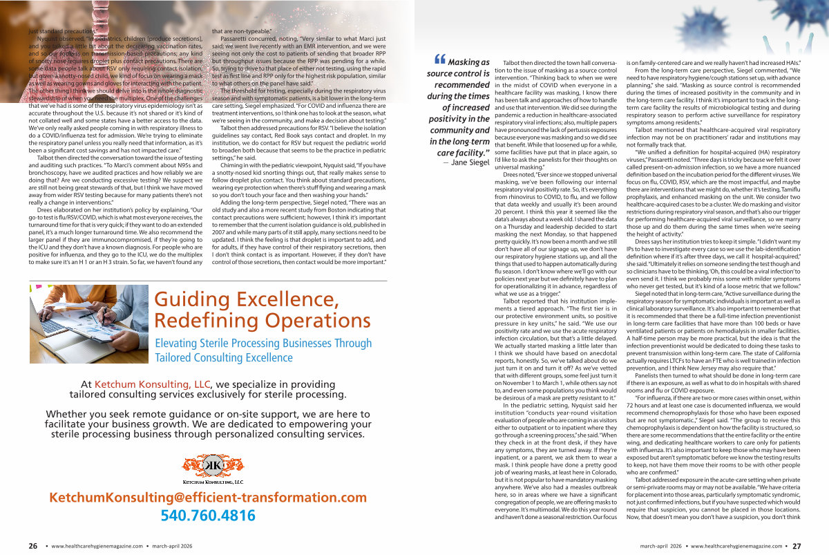 From the long-term care perspective, Siegel commented,“ We need to have respiratory hygiene / cough stations set up, with advance planning,” she said.“ Masking as source control is recommended during the times of increased positivity in the community and in the long-term care facility. I think it’ s important to track in the longterm care facility the results of microbiological testing and during respiratory season to perform active surveillance for respiratory symptoms among residents.”