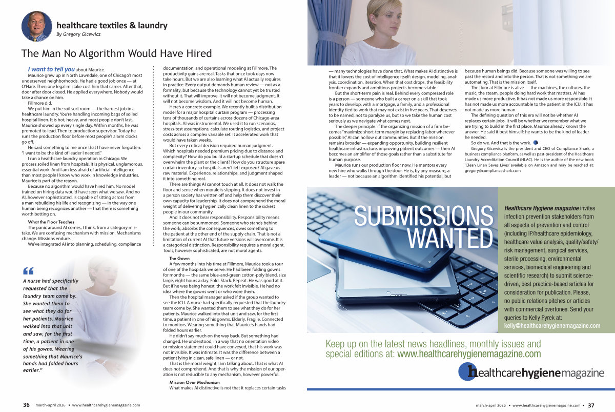 There are things AI cannot touch at all. It does not walk the floor and sense when morale is slipping. It does not invest in a person society has written off and help them discover their own capacity for leadership. It does not comprehend the moral weight of delivering hygienically clean linen to the sickest people in our community.