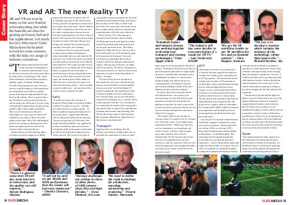 consumption increases complexity for the entire production and distribution chain, and mirrors the early days of OTT video. It will be some time before we reach a point of maturity, and in the meantime rapid evolution, innovation and experimentation will be the order of the day.” Thierry Fautier, VP of video strategy at Harmonic, Board Member and Co-founder of VR Industry Forum, notes that AR is being used in the professional broadcast space, but not yet in the consumer space.“ VR is being deployed by NBA and Turner. There are also a lot of trials underway, so VR is definitely going to be important for broadcast,” he asserts, nevertheless accepting that the broadcast workflow needs to be changed completely for capture, stitching, post production, encoding and FoV streaming.“ VR delivery will mostly be over unicast networks. In order to deliver a tiled approach, we need to resolve the problem of latency,” he states.