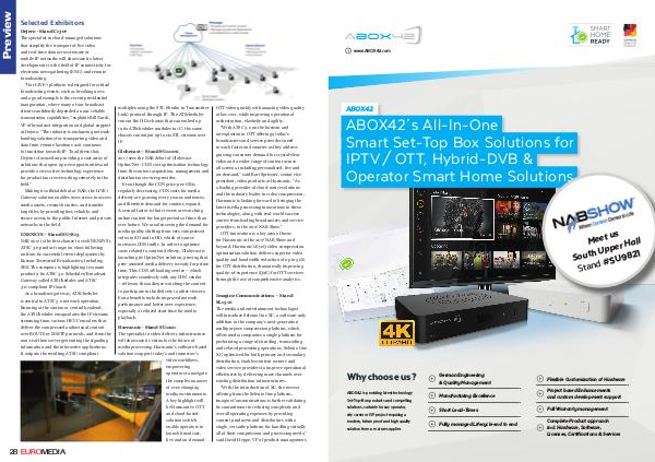 Harmonic- Stand SU1210 The specialist in video delivery infrastructure will showcase its vision for the future of media processing. Harmonic’ s software-based solutions support today’ s and tomorrow’ s video workflows, empowering operators to navigate the complex nuances of ever-changing media environments. A key highlight will be Harmonic’ s OTT and cloud-based solutions which enable operators to launch broadcast, live and on-demand