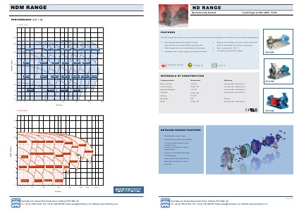 The ND range has been in use for over 30 years and can be modified to suit all manner of unusual applications. n n n Dynamically balanced impeller to give high efficiency and low NPSH requirements. Shaft supported by oil lubricated ball bearings. Available with a wide range of mechanical seals. n n n Back pull out design so rotor can be removed without disturbing the motor or pipework. Max. temperature 120 oC. Available with NACE welding.