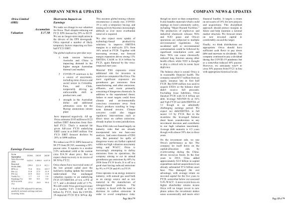 Finally , we think distributions are appropriate . Orica should have sufficient cash flows to pay down debt and maintain its dividends . The company continued to pay a dividend during the COVID-19 pandemic but at a somewhat reduced 44 % payout . However , we anticipate return to circa 50 % payouts from FY21 in line with appropriate historical levels .