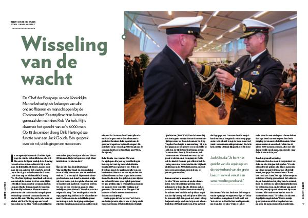 De Chef der Equipage van de Koninklijke Marine behartigt de belangen van alle onderofficieren en manschappen bij de Commandant Zeestrijdkrachten luitenantgeneraal der mariniers Rob Verkerk. Hij is daarmee het gezicht van zo’ n 6.000 man. Op 15 december droeg Dirk Harting deze functie over aan Jack Gouda. Een gesprek over de rol, uitdagingen en successen.