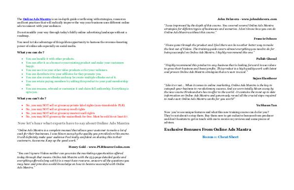 “ Like it or not... When it comes to online marketing, Online Ads Mantra is the key to catapult your business to revolutionary success. And we were totally blown away by the new course Firelaunchers has to offer to the world- It contains the most up to date information on Online Ads Mantra and generously reveal all the crucial steps required to make sure Online Ads Mantra works for you 100 %!”