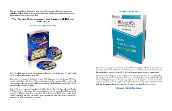 This is a comprehensive Research Report on effective online advertising techniques including: Videos, Tools, Training courses, Forums, Affiliate programs, Demographics, Infographics, Facts, and Case studies.