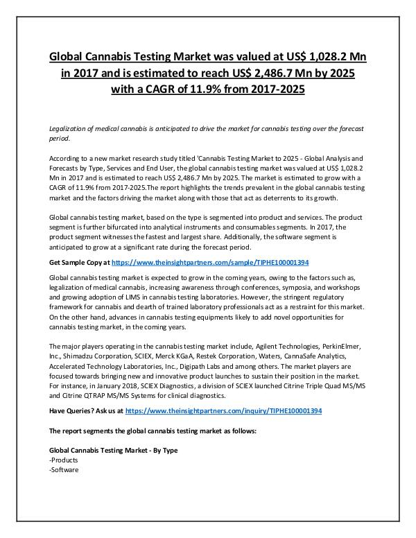 CAGR of 11.9% from 2017-2025.The report highlights the trends prevalent in the global cannabis testing