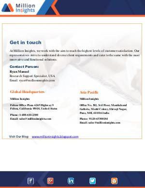 Get in touch At Million Insights, we work with the aim to reach the highest levels of customer satisfaction. Our representatives strive to understand diverse client requirements and cater to the same with the most innovative and functional solutions. Contact Person: Ryan Manuel Research Support Specialist, USA Email: ryan@millioninsights.com Global Headquarters Asia Pacific Million Insights Million Insights Felton Office Plaza 6265 Highway 9 Felton, California 95018, United States Office No. 302, 3rd Floor, Manikchand Galleria, Model Colony, Shivaji Nagar, Pune, MH, 411016 India Phone: 1-408-610-2300 Email: sales@millioninsights.com Visit Our Blog: www.millioninsights.blogspot.com Phone: 91-20-65300184 Email: sales@millioninsights.com
