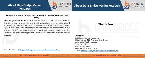 About Data Bridge Market Research An absolute way to forecast what future holds is to comprehend the trend today! Data Bridge Market Research set forth itself as an unconventional and neoteric Market research and consulting firm with unparalleled level of resilience and integrated approaches. We are determined to unearth the best market opportunities and foster efficient information for your business to thrive in the market. Data Bridge endeavours to provide appropriate solutions to the complex business challenges and initiates an effortless decision-making process. Read Continue : http://databridgemarketresearch.com/about-us/ 6 databridgemarketresearch.com US : +1-888-387-2818 UK : +44-161-394-0625 sales@databridgemarketresearch.com