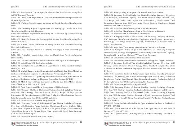 Table 3-70: Key Operating Assumptions for Srikalahasthi Pipes Limited Table 3-71: Company Profile of Jindal Saw Limited Including Company Overview, USP, Strategies, Production Capacity, Production, Product Range, Product Class, Size Range( Both Jindal SAW Gujarat and Maharashtra), Headquarters, Total Production, Revenue from DI Pipes, Major Export Regions, Employees, Export turnover, PAT and Net Revenue Table 3-72: Jindal Saw Manufacturing Plant at Mundra, Gujarat Table 3-73: Jindal Saw Manufacturing Plant at Distt Solapur, Maharashtra Table 3-74: Jindal Saw Ltd. International Accreditations Table 3-75: Company Profile of Electrotherm Ltd. Including Company Overview, USP, Strategies, Manufacturing Facilities, Employees, Major Exports, Headquarters, Size Range, Class Range, Production Capacity, Production, PAT, Revenue from DI Pipes, Gross Revenue Table 3-76: Major Joint Ventures and Acquisition by Electrotherm Limited Table 3-77: Company Profile of Jai Balaji Industries Ltd. Including Company Overview, USP, Strategy, Headquarters, Manufacturing Plant, Production Capacity, Production, Revenue from DI pipes, PAT and Gross Revenues Table 3-78: Jai Balaji Industries Limited Plant Locations Table 3-79: Jai Balaji Industries Limited Distribution Strategy and Target Customers Table 3-80: Company Profile of Tata Metaliks Including Company Overview, USP, Strategy, Global Presence, Product Range, Class, Standard Length, Production Capacity, Production, Number of Employees, Revenue from DI Pipes and PBT from DI Pipes Table 3-81: Company Profile of Sathavahana Ispat Limited Including Company Overview, USP, Strategy, Order Book, Technology Used, Headquarters, Number of Employees, Product Size, Product Class, Production Capacity, Production, Sales of DI Pipes, Revenue from DI Pipes, Market Cap, Net Revenue, PBT Table 3-82: Timeline of Sathavahana Ispat Limited Table 3-83: Company Profile of Rashmi Metaliks Limited Including Company Overview, USP, Strategy, Location, Production, Production Capacity and Revenues Table 3-84: Company Profile of Electrosteel Steels Limited Including Company Overview, USP, Company Strategy, Technology Used, Headquarters, Exports, Total Revenue, Turnover from DI Pipes, Production Capacity, Production, Product Range, EBIDTA, Dealers Table 3-85: Future Outlook of India Ductile Pipes Market on the Basis of Production, FY’ 2017 – FY’ 2022 Table 3-86: Future Outlook of India Ductile Iron Pipes Market on the Basis of Revenue, FY’ 2018 – FY’ 2022 Table 3-87: Major Future and On-Going Projects in India for Boosting Demand of DI Pipes