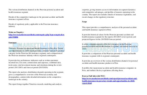 Timetrics ' Personal Accident and Health Insurance in Peru Key Trends and Opportunities to 2020 ' report provides a detailed outlook by product category for the Peruvian life insurance segment, and a comparison of the Peruvian insurance industry with its regional counterparts.