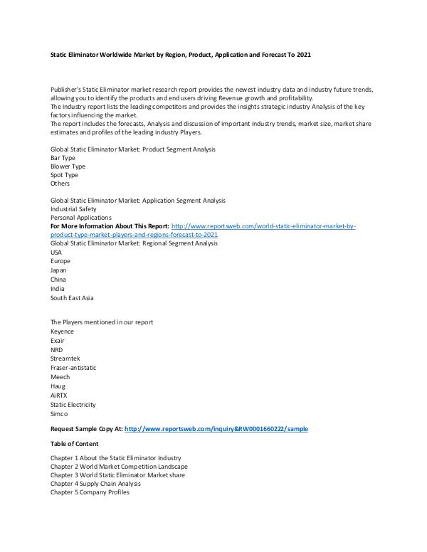 For More Information About This Report: http://www.reportsweb.com/world-static-eliminator-market-by-