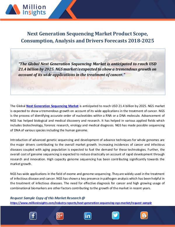 The Global Next Generation Sequencing Market is anticipated to reach USD 21.4 billion by 2025. NGS market