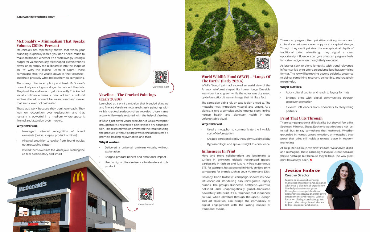 At Tulip Media Group, we don’ t imitate. We analyze, distill, and reimagine. These campaigns inspire us not because they’ re nostalgic but because they’ re bold. The way great print has always been.