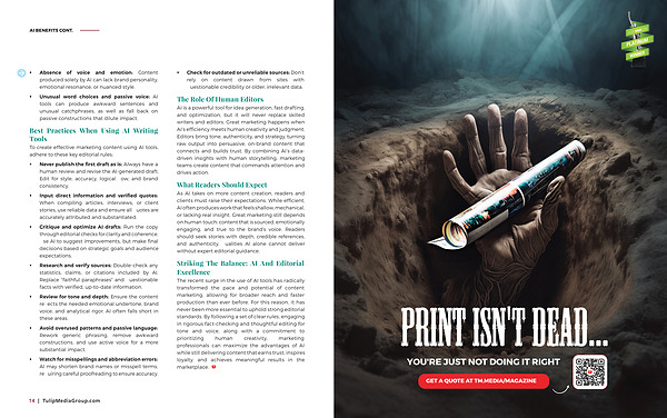 AI is a powerful tool for idea generation, fast drafting, and optimization, but it will never replace skilled writers and editors. Great marketing happens when AI’ s efficiency meets human creativity and judgment. Editors bring tone, authenticity, and strategy, turning raw output into persuasive, on-brand content that connects and builds trust. By combining AI’ s datadriven insights with human storytelling, marketing teams create content that commands attention and drives action.
