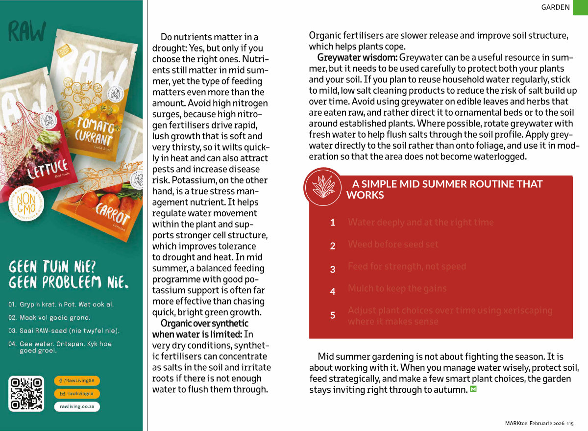 Greywater wisdom: Greywater can be a useful resource in summer, but it needs to be used carefully to protect both your plants and your soil. If you plan to reuse household water regularly, stick to mild, low salt cleaning products to reduce the risk of salt build up over time. Avoid using greywater on edible leaves and herbs that are eaten raw, and rather direct it to ornamental beds or to the soil around established plants. Where possible, rotate greywater with fresh water to help flush salts through the soil profile. Apply greywater directly to the soil rather than onto foliage, and use it in moderation so that the area does not become waterlogged.