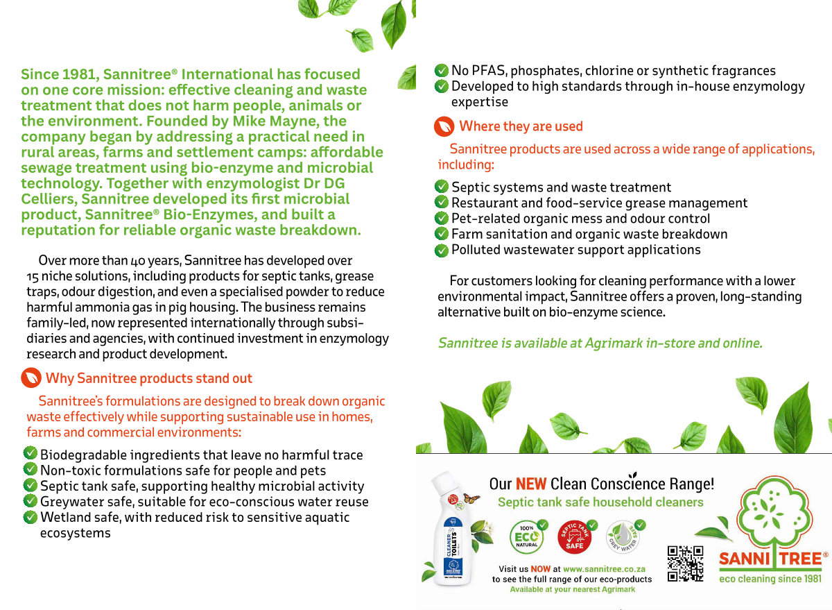 Since 1981, Sannitree ® International has focused on one core mission: effective cleaning and waste treatment that does not harm people, animals or the environment. Founded by Mike Mayne, the company began by addressing a practical need in rural areas, farms and settlement camps: affordable sewage treatment using bio-enzyme and microbial technology. Together with enzymologist Dr DG Celliers, Sannitree developed its first microbial product, Sannitree ® Bio-Enzymes, and built a reputation for reliable organic waste breakdown.