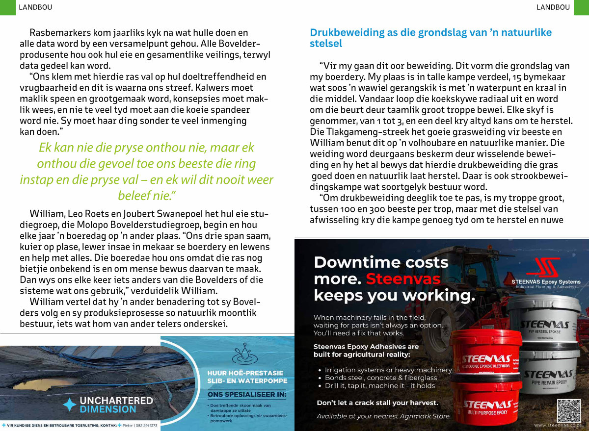 “ Om drukbeweiding deeglik toe te pas, is my troppe groot, tussen 100 en 300 beeste per trop, maar met die stelsel van afwisseling kry die kampe genoeg tyd om te herstel en nuwe