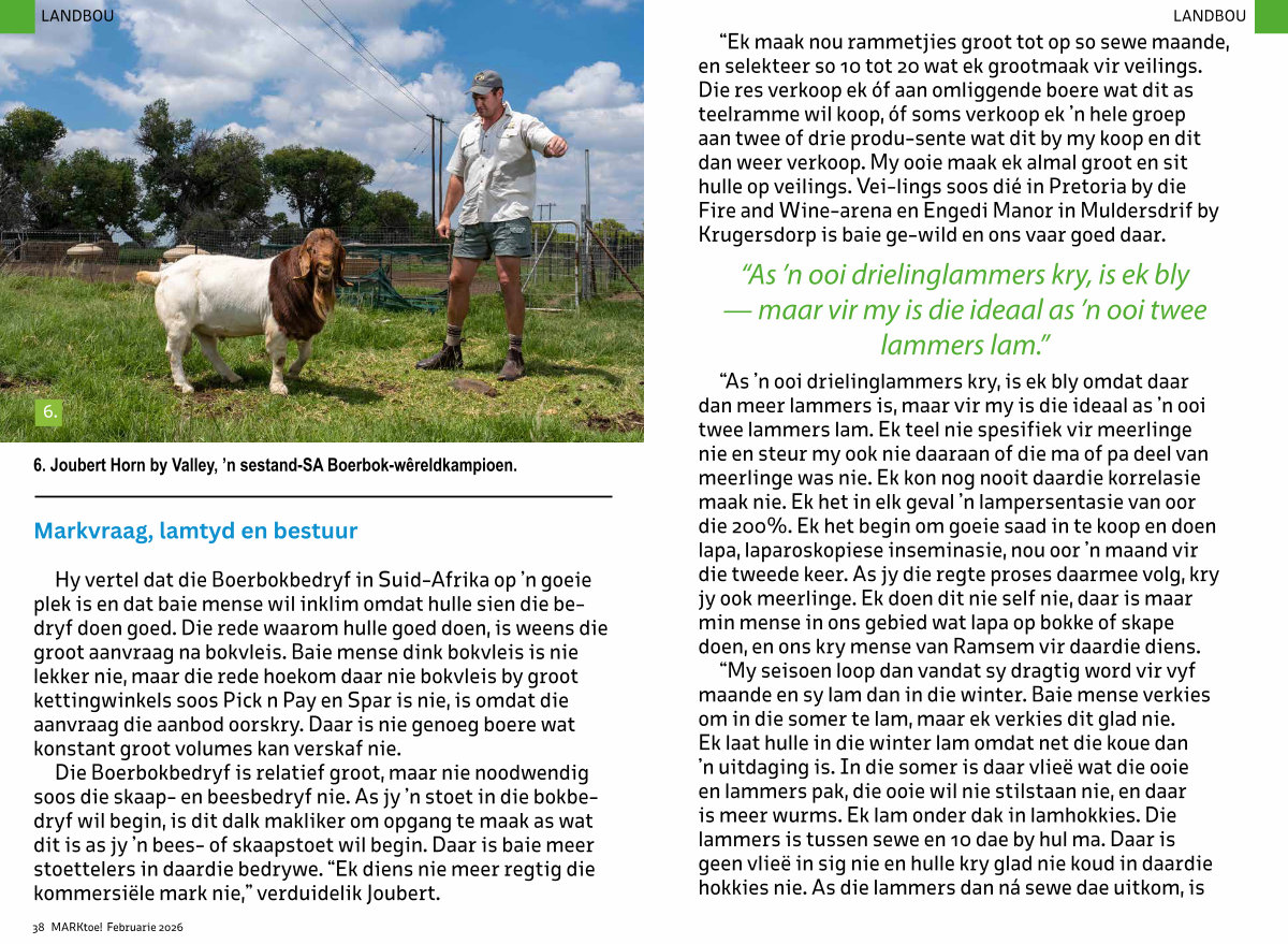 Die Boerbokbedryf is relatief groot, maar nie noodwendig soos die skaap- en beesbedryf nie. As jy’ n stoet in die bokbedryf wil begin, is dit dalk makliker om opgang te maak as wat dit is as jy’ n bees- of skaapstoet wil begin. Daar is baie meer stoettelers in daardie bedrywe.“ Ek diens nie meer regtig die kommersiële mark nie,” verduidelik Joubert.