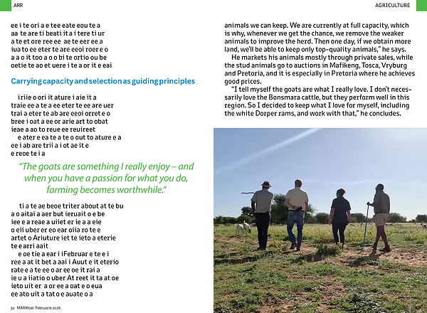 “ They come twice a year, in mid-February when the veld is green and at its best, and again in August when it deteriorates. They can then see how far we’ ve gone with grazing and give us an indication of numbers. At present it stands at one livestock unit per 13 ha for sheep and goats. One cow equals seven small-stock units, and that’ s how we calculate how many
