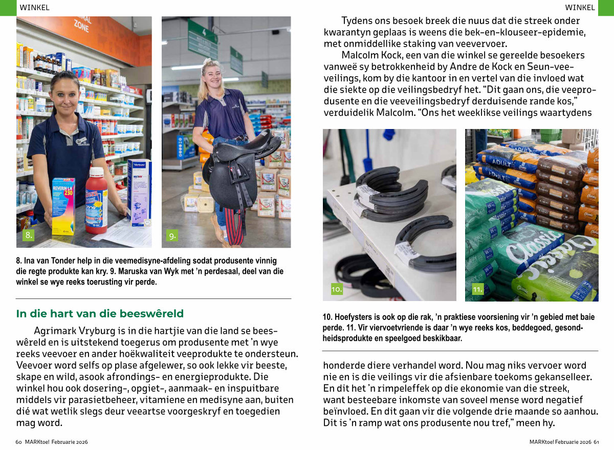 Malcolm Kock, een van die winkel se gereelde besoekers vanweë sy betrokkenheid by Andre de Kock en Seun-veeveilings, kom by die kantoor in en vertel van die invloed wat die siekte op die veilingsbedryf het.“ Dit gaan ons, die veeprodusente en die veeveilingsbedryf derduisende rande kos,” verduidelik Malcolm.“ Ons het weeklikse veilings waartydens