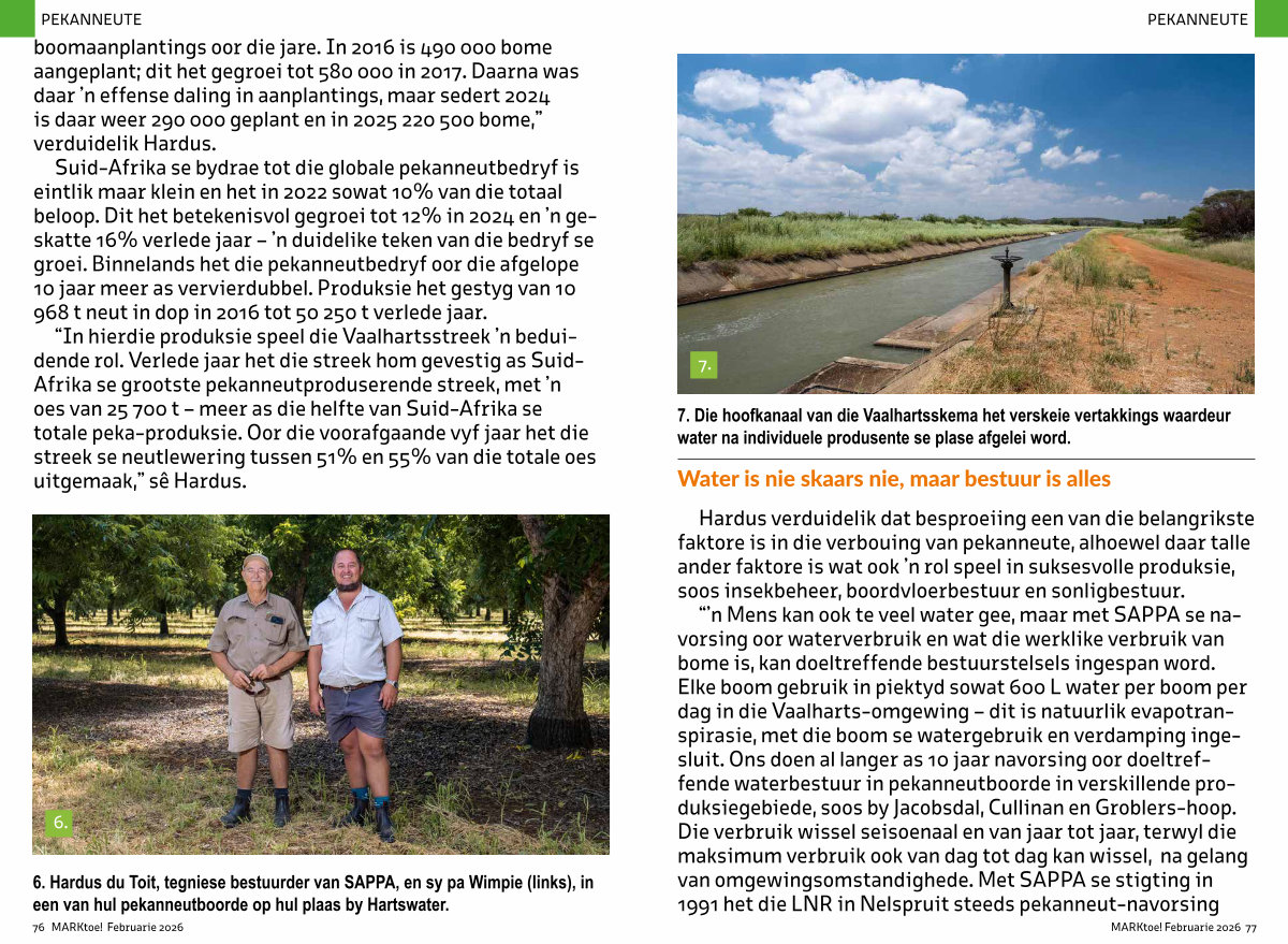 “ In hierdie produksie speel die Vaalhartsstreek’ n beduidende rol. Verlede jaar het die streek hom gevestig as Suid- Afrika se grootste pekanneutproduserende streek, met’ n oes van 25 700 t – meer as die helfte van Suid-Afrika se totale peka-produksie. Oor die voorafgaande vyf jaar het die streek se neutlewering tussen 51 % en 55 % van die totale oes uitgemaak,” sê Hardus.