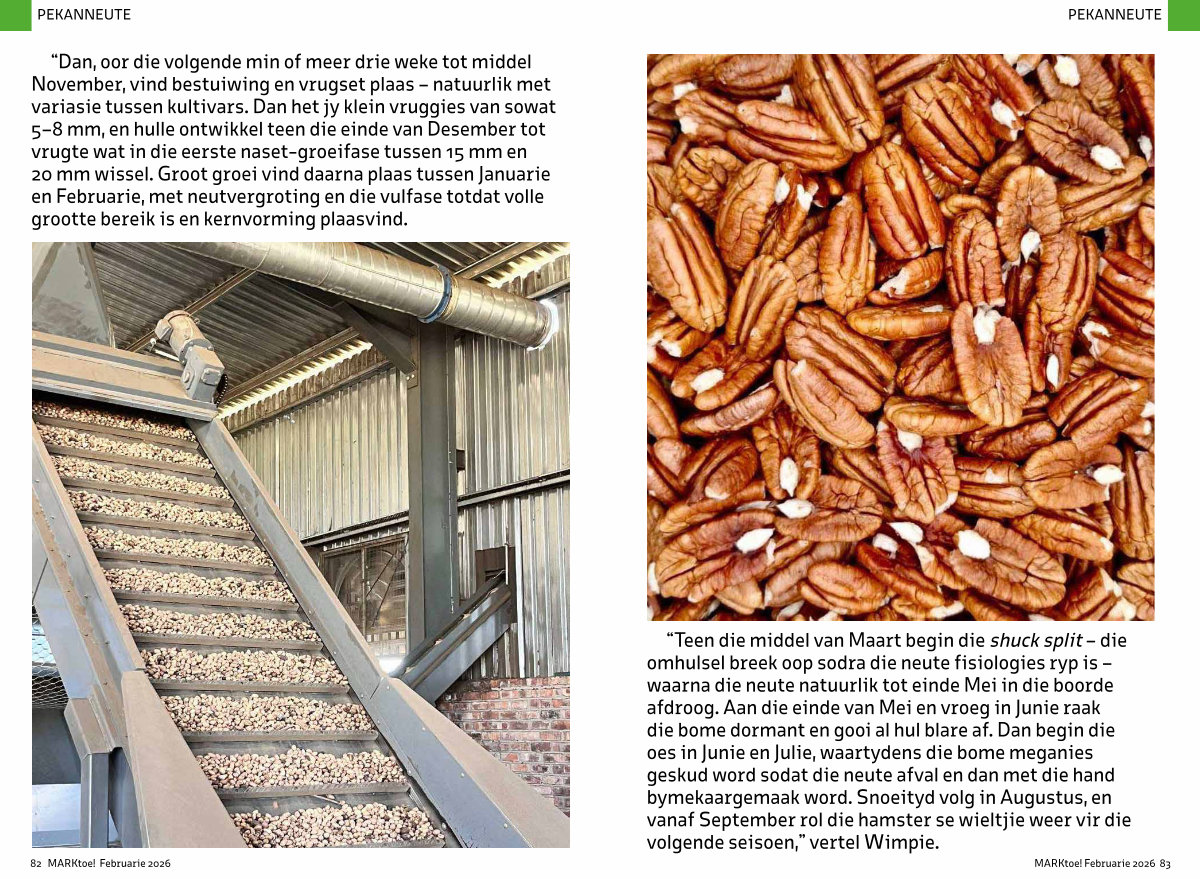 “ Teen die middel van Maart begin die shuck split – die omhulsel breek oop sodra die neute fisiologies ryp is – waarna die neute natuurlik tot einde Mei in die boorde afdroog. Aan die einde van Mei en vroeg in Junie raak die bome dormant en gooi al hul blare af. Dan begin die oes in Junie en Julie, waartydens die bome meganies geskud word sodat die neute afval en dan met die hand bymekaargemaak word. Snoeityd volg in Augustus, en vanaf September rol die hamster se wieltjie weer vir die volgende seisoen,” vertel Wimpie.