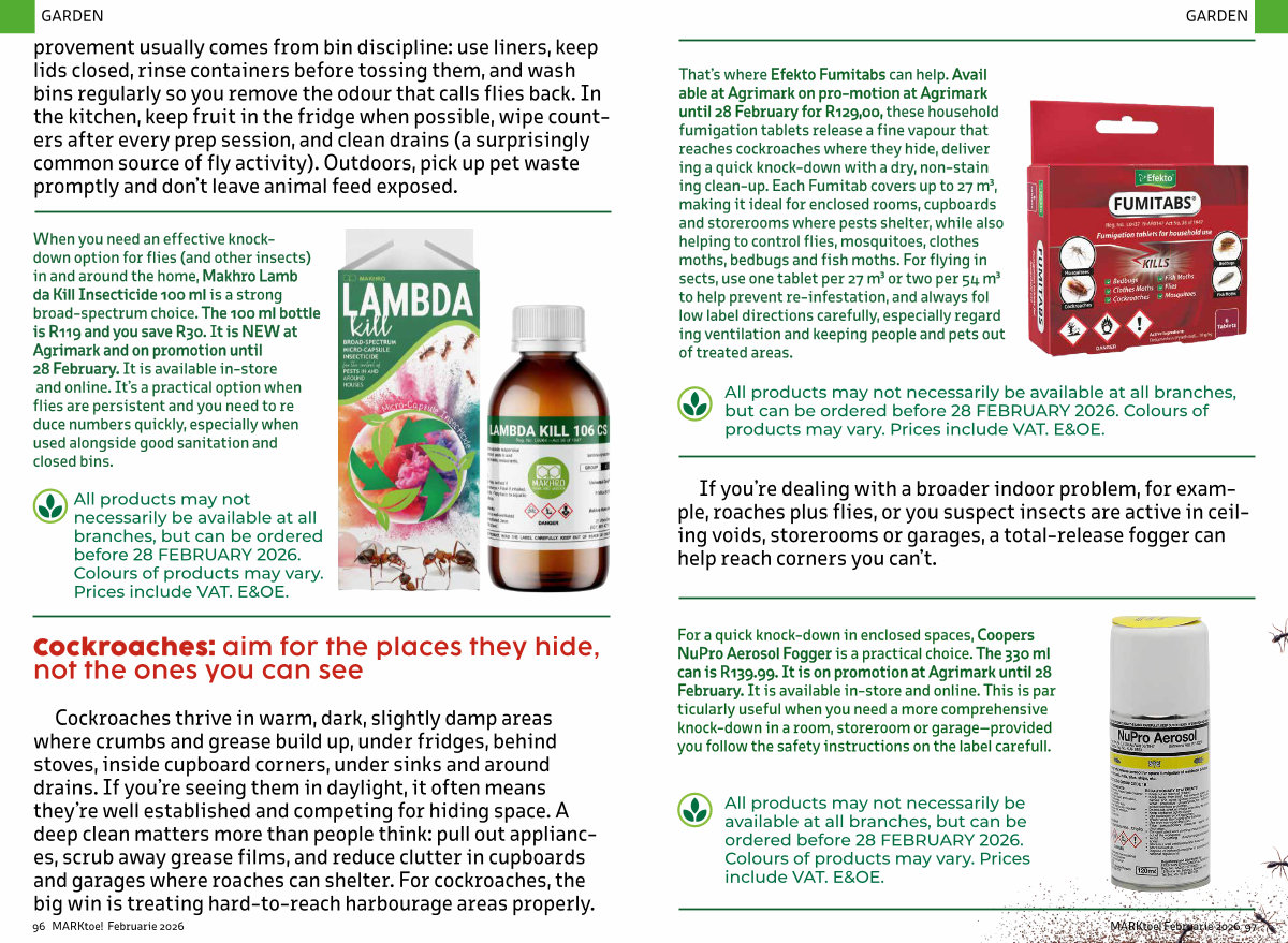 That’ s where Efekto Fumitabs can help. Avail able at Agrimark on pro-motion at Agrimark until 28 February for R129,00, these household fumigation tablets release a fine vapour that reaches cockroaches where they hide, deliver ing a quick knock-down with a dry, non-stain ing clean-up. Each Fumitab covers up to 27 m ³, making it ideal for enclosed rooms, cupboards and storerooms where pests shelter, while also helping to control flies, mosquitoes, clothes moths, bedbugs and fish moths. For flying in sects, use one tablet per 27 m ³ or two per 54 m ³ to help prevent re-infestation, and always fol low label directions carefully, especially regard ing ventilation and keeping people and pets out of treated areas.