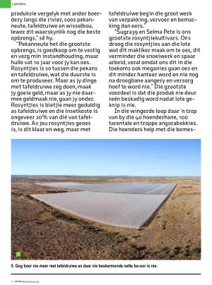“ Pekanneute het die grootste opbrengs , is goedkoop om te vestig en verg min instandhouding , maar hulle vat 10 jaar voor jy kan oes . Rosyntjies is so tussen die pekans en tafeldruiwe , wat die duurste is om te produseer . Maar as jy dinge met tafeldruiwe reg doen , maak jy goeie geld , maar as jy nie daarmee geldmaak nie , gaan jy onder . Rosyntjies is bietjie meer geduldig as tafeldruiwe en die insetkoste is ongeveer 20 % van dié van tafeldruiwe . As jou rosyntjies geoes is , is dit klaar en weg , maar met