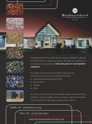 Bushmanland Minerals is a South African company established in 1982 and concerned with the sourcing , purchasing , marketing and exporting of semi-precious stones globally and NOW AVAILABLE AT YOUR NEAREST AGRIMARK .
