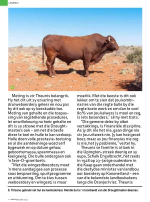 Meting is vir Theunis belangrik . Hy het dit uit sy ervaring met druiweboerdery geleer en nou pas hy dit ook op sy beeskudde toe . Meting van gehalte en die toepassing van regstellende prosedures , lei onwillekeurig na hoër gehalte en dit is sy strewe met die Droughtmasters ook – om net die beste diere te teel en hulle te kan verkoop . Hulle doen volle prestasie-toetsing en al die aantekeninge word self bygewerk en op datum gehou : geboortemassa , speenmassa en koeigewig . Die bulle ondergaan ook ‘ n fase-D-groeitoets .