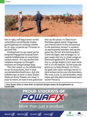 Vandag boer hy op sowat 90 ha besproeiingsgrond waarop hoofsaaklik tafeldruiwe en rosyntjies verbou word – dis nou buiten die veeplase waarop sy Droughtmasters en Dorperskape loop .