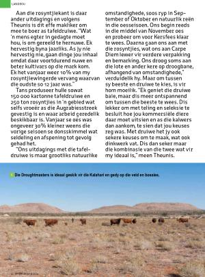 “ Ons uitdagings met die tafeldruiwe is maar grootliks natuurlike omstandighede , soos ryp in September of Oktober en natuurlik reën in die oesseisoen . Ons begin reeds in die middel van November oes en probeer om voor Kersfees klaar te wees . Daarna gaan ons aan met die rosyntjies , wat ons aan Carpe Diem lewer vir verdere verpakking en bemarking . Ons droog soms aan die lote en ander kere op droogbane , afhangend van omstandighede ,” verduidelik hy . Maar om tussen sy beeste en druiwe te kies , is vir hom moeilik . “ Ek geniet die druiwe baie , maar dis meer ontspannend om tussen die beeste te wees . Dis lekker om met teling en seleksie te besluit hoe jou kommersiële diere daar moet uitsien en as die kalwers dan aankom , te sien dat jou keuses reg was . Met druiwe het jy ook sekere keuses om te maak , wat ook dinkwerk vat . Dis dan seker maar die kombinasie van die twee wat vir my ideaal is ,” meen Theunis .